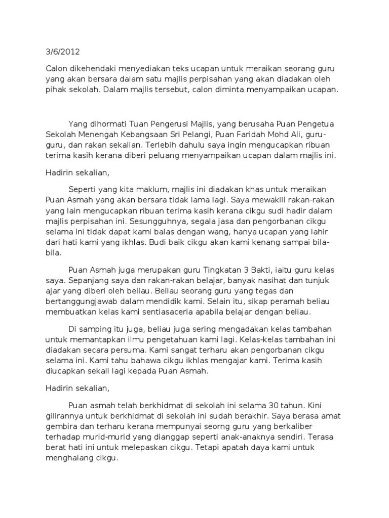 Kata mutiara islami tentang guru guru . Teks ucapan perpisahan guru bersara. Tidak ada perpisahan di antara kita. Pada malam ini juga pengurusan risda akan. Hamzah, ydp pibg en abdul ghafar b. Doc contoh ucapan wakil murid untuk majlis persaraan sharina sharina academia edu.